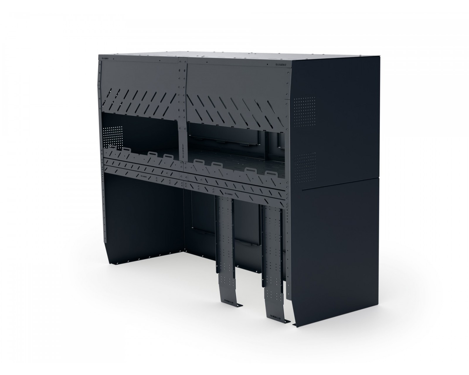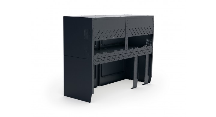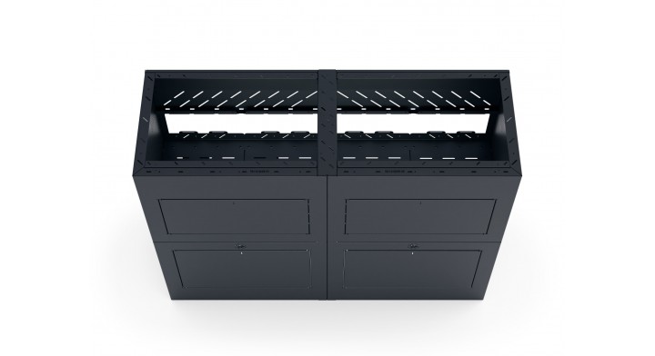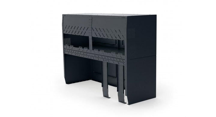 Mebel garażowy z systemem wentylacji przygotowany do montażu elektroniki, baterii, power station, różnych systemów ogrzewania (powietrze-powietrze, powietrze-woda). Do zamontowania po prawej lub po lewej stronie samochodu. Wyposażony w 4 perforowane płyty montażowe do montażu elektroniki, podwieszania przewodów, z kanałami elektrycznymi i uchwytami do montażu pasów transportowych, czterema demontowanymi półkami.