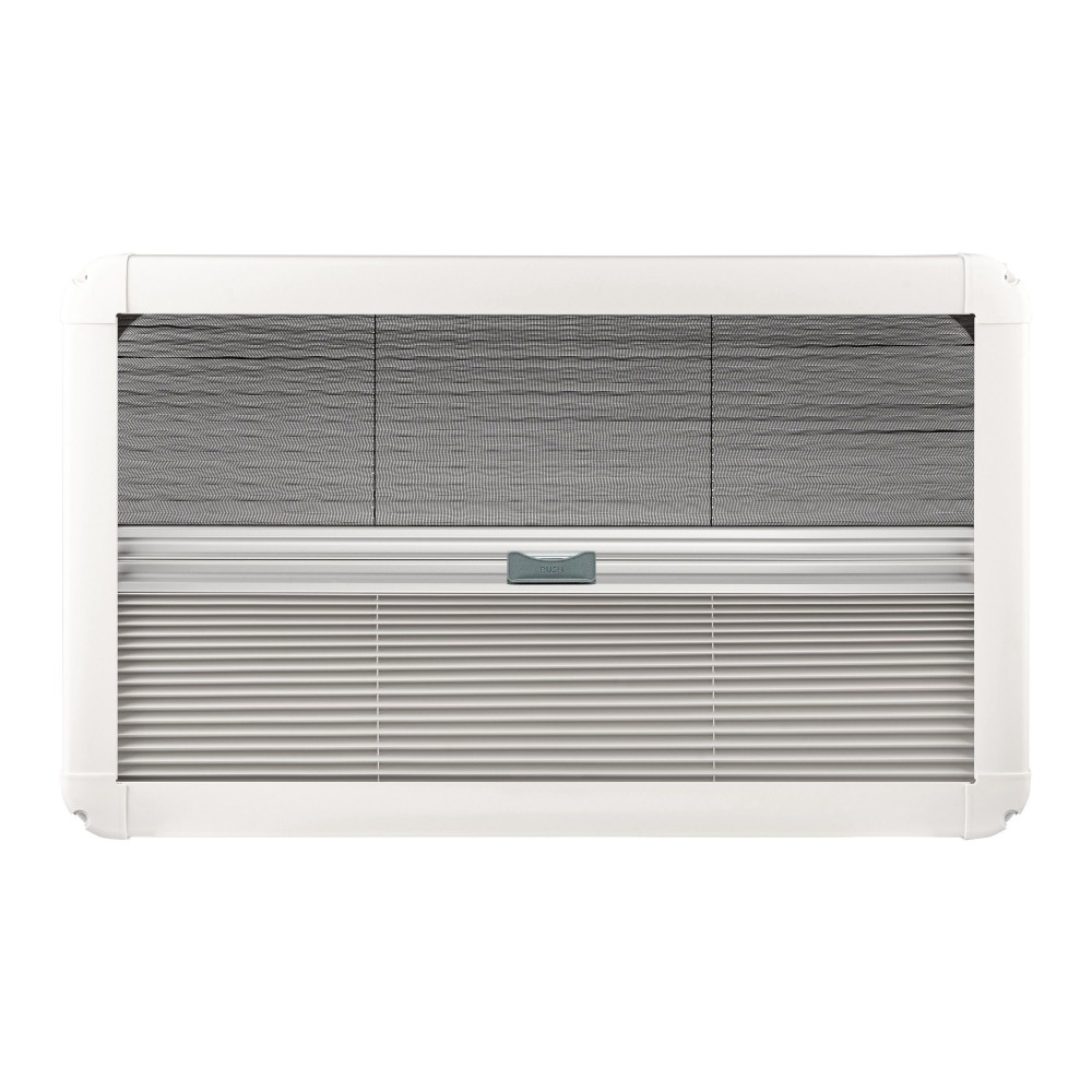 – okno wyposażone jest w zintegrowaną plisowaną roletę oraz moskitierę. Roleta pokryta jest od zewnątrz warstwą termoizolacyjną, dzięki czemu ogranicza nagrzewanie się wnętrza kampera. Roleta wyposażona jest w klips umożliwiający zintegrowanie rolety wraz z moskitierą i jednoczesne regulowanie rolety i moskitiery przy użyciu jednej ręki,